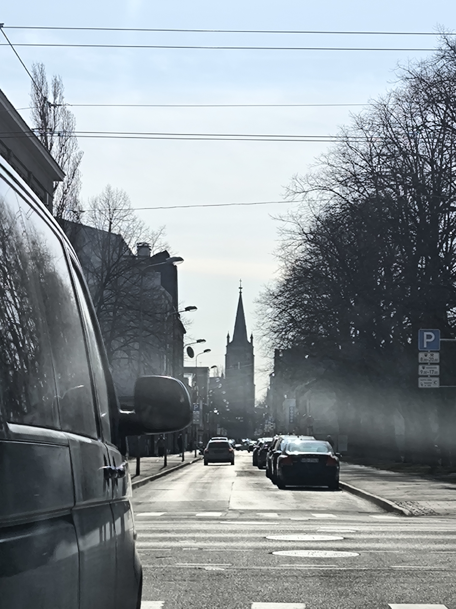 The image depicts an urban street scene in Riga, Latvia, specifically along Slokas iela, looking eastward towards St. Martin's Church (Mārtiņa baznīca). In the immediate foreground, occupying the left third of the frame, is the dark-colored side and passenger side mirror of a van or minibus, reflective surfaces showing faint distortions of the surroundings. The asphalt road extends into the midground, marked with white painted crosswalk stripes and circular reflective elements. A lane of traffic proceeds down the center, with at least two cars visible in the distance, followed by additional vehicles further back, partially obscured by atmospheric haze. On the right side of the road, a line of cars is parked parallel to the curb, next to a sidewalk and a row of bare deciduous trees, suggesting late autumn, winter, or early spring. A blue square parking sign, marked with a white "P" and displaying time restrictions (e.g., "8-20" and "9-17"), is visible on the right. Streetlights with extended arms line both sides of the street. Multi-story buildings, dark-toned and largely obscured by trees, form the backdrop on either side of the road. In the distant background, dominating the center, stands the tall, pointed steeple of St. Martin's Church, topped with a cross finial. The sky is a pale blue with atmospheric haze, and no individuals are clearly discernible.