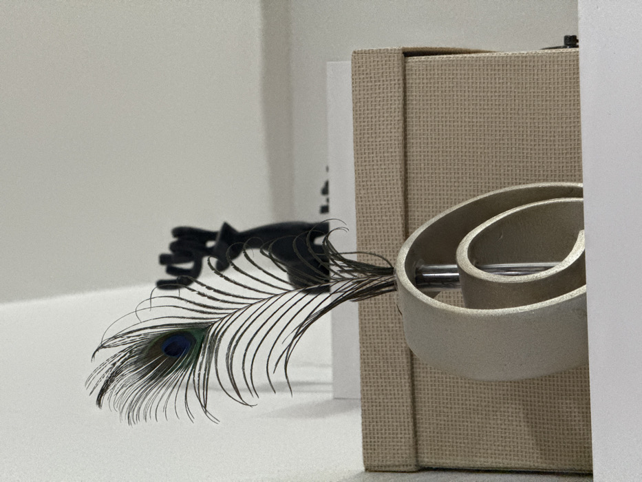In Dos Hermanas, Spain, an indoor scene displays a single peacock feather standing upright within a modern, light-beige, abstract-sculptural vase. The vase consists of two interwoven, textured, ovoid shapes, encasing a clear glass tube that holds the feather. The feather exhibits a distinct blue and green 'eye' pattern near its tip. The vase rests on a white, flat surface, likely a shelf. Behind the vase, a rectangular, light-brown box with a fine, textured weave is visible. Above this box and to the left of a black, antler-like or stylized hand sculpture, white objects resembling stacked books or flat boxes are present. The background consists of a plain white wall, illuminated by ambient light. No individuals are present.