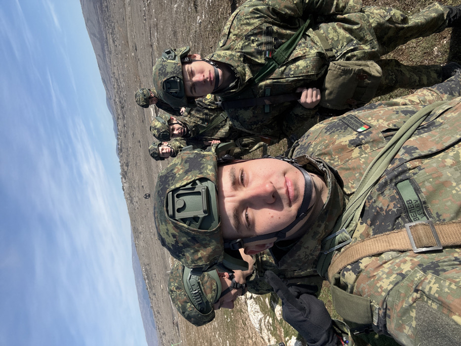 This image depicts six male soldiers of the Bulgarian armed forces on an outdoor training ground or firing range in the vicinity of Slivnitsa, Bulgaria