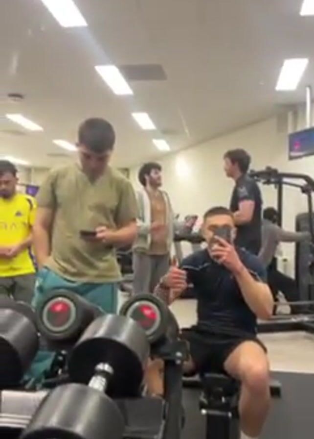 interior of a well-lit gym with various fitness machines and equipment. Several people are present, engaged in different activities. In the foreground, a man in a navy shirt and black shorts is sitting on a bench and taking a selfie with his phone. To his left, a rack of dumbbells is visible. In the background, other men are either on their phones, talking to each other, or using gym equipment. A man in a green shirt is checking his phone, and another man in a black shirt is walking past a seated individual using a leg press machine. The scene provides a glimpse into a typical gym environment with people focused on their fitness routines.