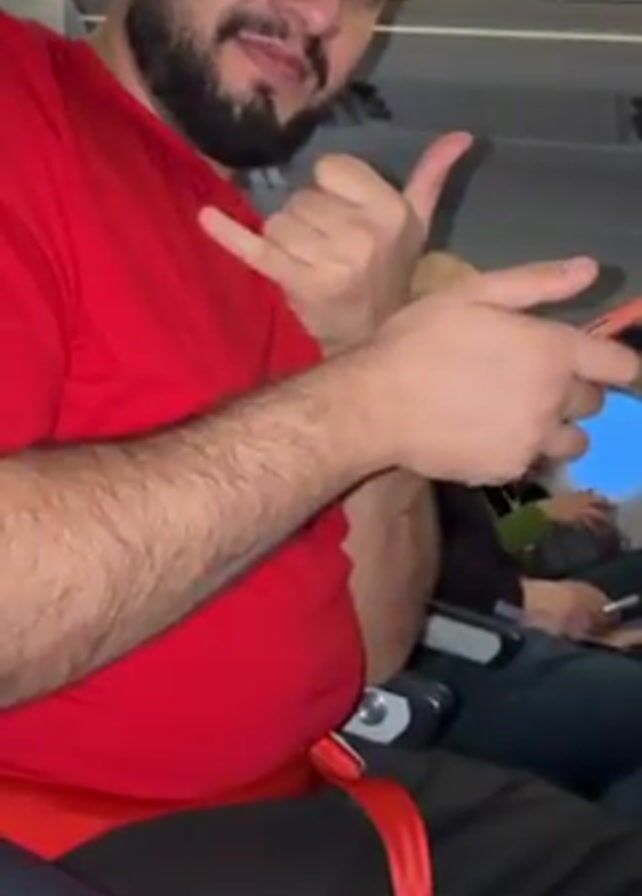 A man in a red t-shirt sits in an airplane seat. He looks at the camera and makes a shaka sign with his left hand. In his right hand he is holding a smartphone. The seat is gray, and the seatbelt is red. A passenger sits next to him to his right.