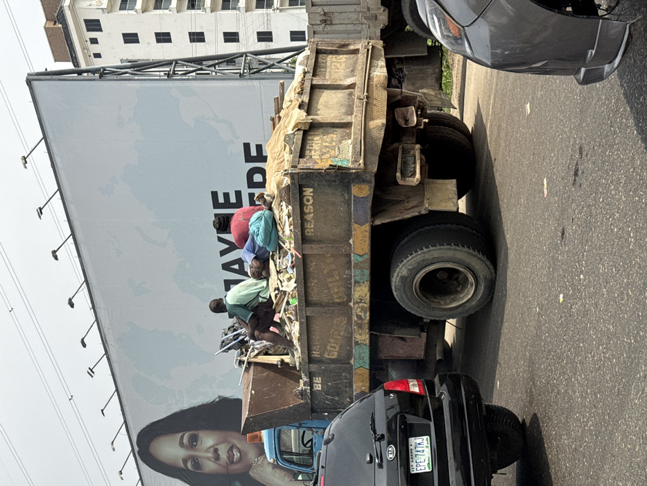 This image captures a street scene in Ilado, Nigeria, under bright daylight conditions. The foreground features an asphalt road with visible lane markings. The central subject is a heavily weathered and rusty dump truck, primarily brown with faded blue, yellow, and green stripes along the lower bed. The truck's bed is filled with a heterogeneous mix of scrap materials, including metal, wood, cardboard, and various debris. Three individuals are riding atop this refuse. The leftmost person is a dark-skinned male wearing a light green shirt and dark shorts, seated upright and facing away. To his right, another individual lies partially obscured, wrapped in light blue and turquoise fabric. The rightmost person is a dark-skinned male in a red shirt and dark pants, also seated upright and facing away. Text visible on the truck includes "BE HAPPY," "GOODS ONLY," "REASON," and "MEDIA REMIX WTS." The rear of the truck shows exposed light fixtures lacking covers. To the left of the truck, the rear of a black Kia SUV or car is visible, displaying a Nigerian license plate "LAGOS EPE 747KJ." Partially obscured behind the Kia is the front portion of an older blue truck cab. To the right of the main truck, the front bumper of a grey vehicle is partially visible. In the background, a large billboard dominates the upper frame. The left side of the billboard features a close-up image of a smiling woman with dark hair. Partially visible text on the billboard reads "JAYNE HERE." The right side of the billboard is predominantly white with faint topographical patterns. Above the billboard, power lines stretch across a clear, light blue sky. Behind the right side of the billboard, a multi-story white building with multiple balconies and dark-framed windows is visible.