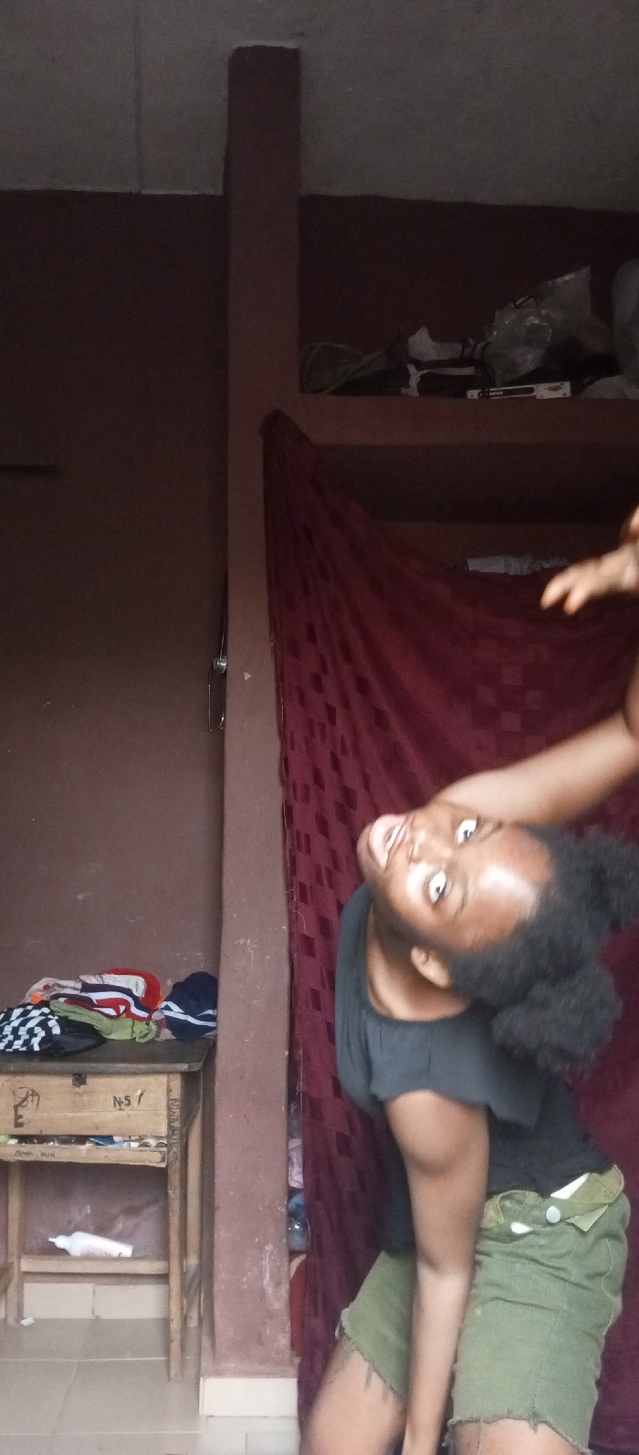 The image depicts an indoor scene in Abuja, Nigeria. In the foreground and right half of the frame, a dark-skinned female individual is captured mid-action, bending forward with her head tilted sharply upwards and to her left. She has dark, curly hair styled into two distinct puffs. Her eyes are open, and her mouth is slightly ajar, revealing teeth. She is wearing a dark, short-sleeved top and olive green shorts with frayed hems, featuring a visible fastener on her left hip. Her right arm is raised, with the hand partially visible above her head. To the left, a light-colored wooden table or desk is present, displaying markings including "N-5 /". On its surface, a stack of folded garments in various colors—red, white, green, blue, and a black-and-white checkered pattern—is visible. A white bottle rests on the tiled floor beneath the table. A prominent vertical concrete pillar extends from the floor to the ceiling, separating the left and right portions of the scene. Behind the individual and to the right, a deep red curtain with a repeating geometric pattern hangs. Above the curtain, an open shelf is visible, holding various items including plastic bags and what appears to be electronic equipment. The walls exhibit a two-tone paint scheme, with a dark reddish-brown lower section and a lighter greyish-brown upper section. The floor is composed of light-colored square tiles. The overall environment suggests a functional residential space under moderate lighting conditions.