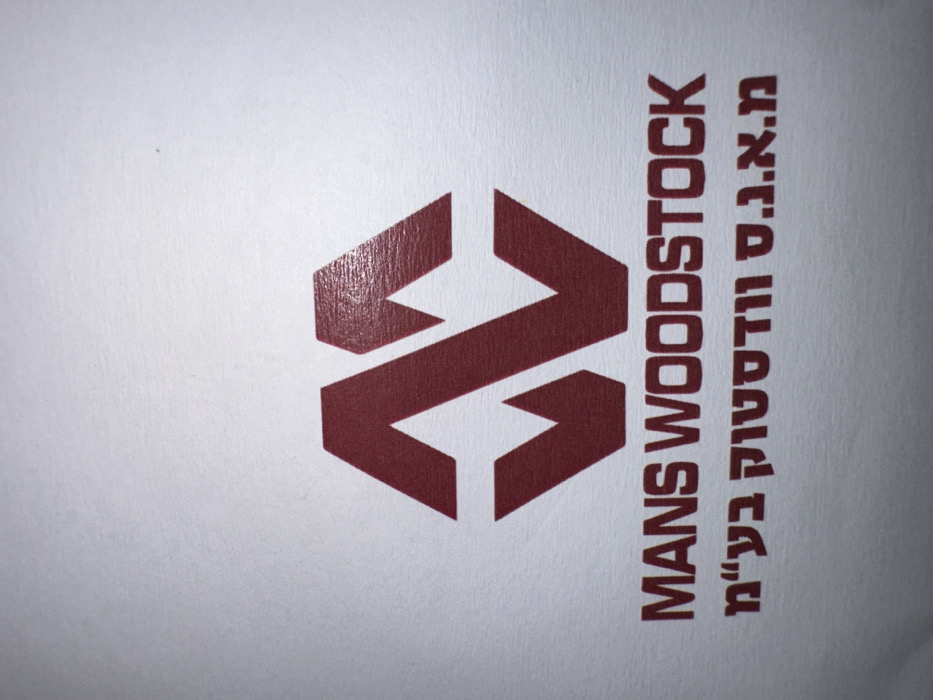 The image displays a close-up view of a logo and associated text against a white, subtly textured background. The central element is a dark red geometric logo, composed of two mirrored shapes resembling stylized 'M' or 'W' letters interlocking to form a central 'N' or an arrow pointing left and right. Below the logo, the words "MANS WOODSTOCK" are printed in dark red, capitalized English letters. Directly beneath the English text, the Hebrew text "מ.א.נ.ס וודסטוק בע"מ" is visible, also in dark red, translating to "M.A.N.S Woodstock Ltd." or "Mans Woodstock Ltd." The background appears to be a flat, light-colored surface, possibly paper or a sign. No people, specific objects beyond the printed material, or discernible environmental context (such as a street, building interior, or exterior) are visible. Therefore, a specific location within Rishon LeZion, Israel, cannot be determined from the visual information provided in this image.