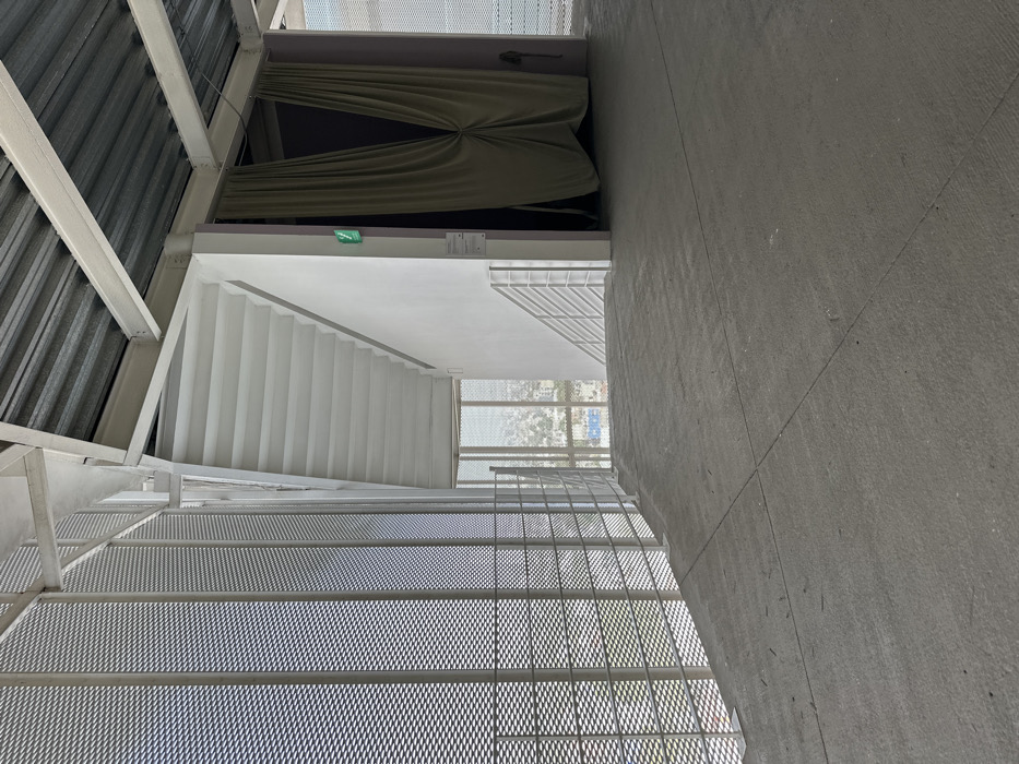 An oblique view showcases architectural elements, dominated by white and gray tones. A metal grid floor extends from the foreground, juxtaposed against a solid gray wall. White stairs ascend into the frame, partially shielded by olive green curtains above. Light filters through windows at the end of the stairs, hinting at an outdoor environment. The structure exhibits a modern, industrial aesthetic.