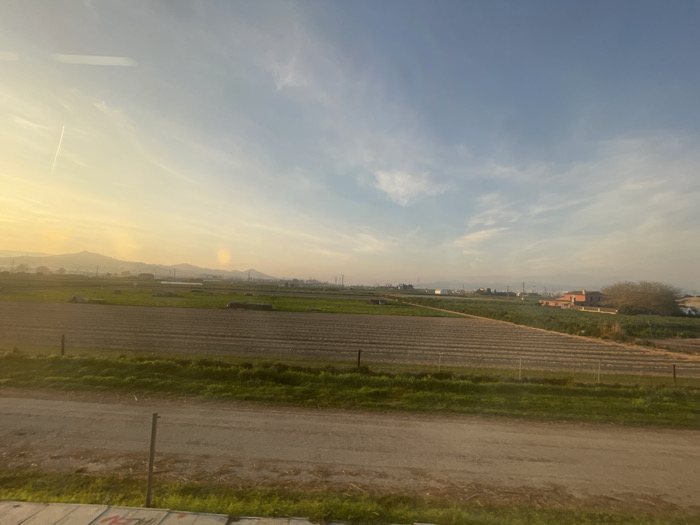 The image displays an expansive agricultural landscape in Sant Boi de Llobregat, Spain, under a sky transitioning from a golden-yellow hue on the left to a clear blue on the right, indicative of sunrise or sunset. Wispy cirrus clouds are scattered across the sky, with a faint aircraft contrail visible in the upper left quadrant. The scene is observed from a slightly elevated position, with a blurred, light-colored object present at the bottom edge of the frame. A dirt path or road traverses the lower midground, bordered by green grass and small plants. Beyond this path, cultivated fields extend into the distance. The central and right foreground fields feature parallel rows of tilled, dark brown soil. To the left and further back, fields of vibrant green crops are visible. Scattered indistinct dark objects, possibly agricultural bales, are present within these fields. In the midground, a rudimentary fence line with vertical posts delineates sections of the fields. The background reveals a reddish-brown residential building with a tiled roof on the right, partially obscured by a cluster of bare trees. Beyond this, a faint silhouette of distant urban or industrial structures is discernible, culminating in a hazy line of mountains stretching across the horizon. A subtle, faint rainbow arc is visible in the sky above the distant mountains in the center-left. No people, specific actions, or interactions are visible.