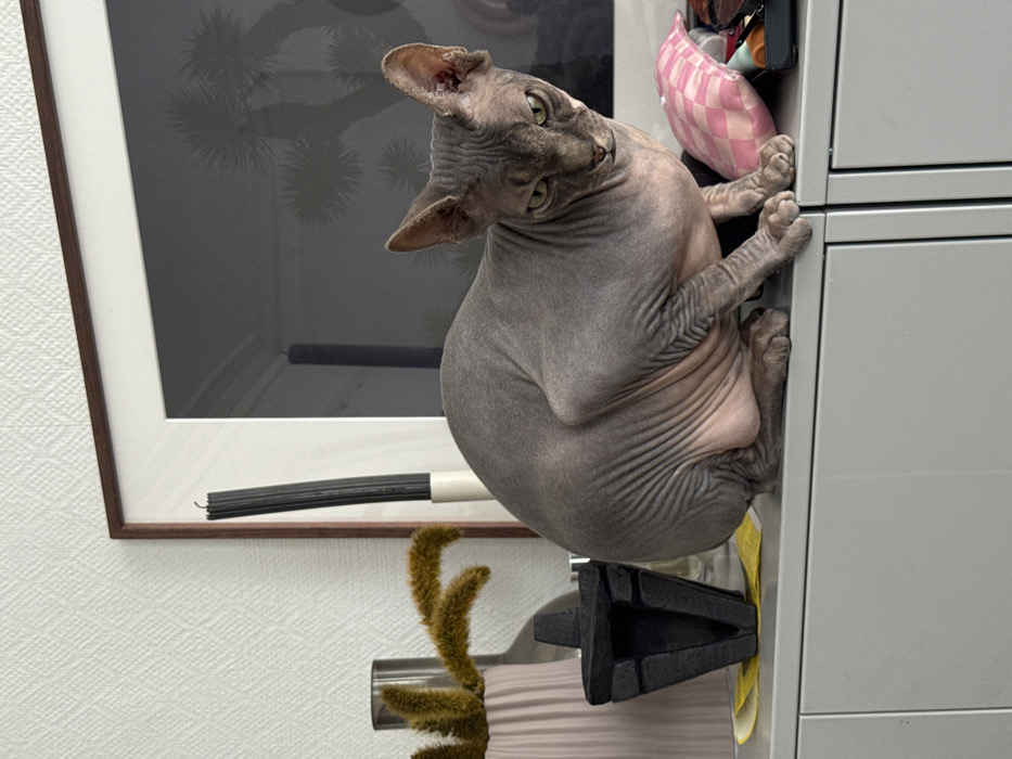 - "An indoor scene in Paris, France, depicts a grey-skinned Sphynx cat with prominent wrinkles and light green eyes, seated on its haunches on a light grey modular cabinet" by FM-QhCsg2, licensed under CC BY 4.0