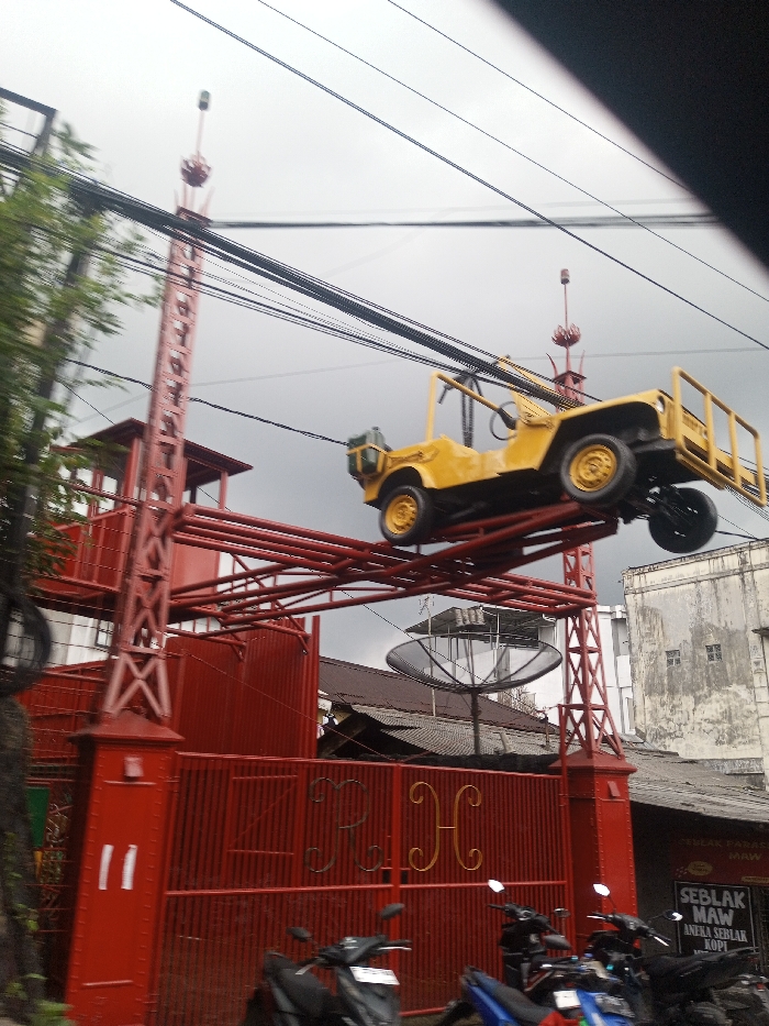 An urban street scene is depicted, situated in the city of Jabalpur, India, under an overcast sky. A prominent, multi-tiered metal structure, painted bright red, dominates the left and central frame, featuring vertical supports and horizontal beams forming a gantry-like display. Elevated on a red metal framework extending from this structure is a yellow open-top jeep-style vehicle, positioned as a static display; its front wheels rest on the framework, while its rear is suspended. At ground level, a red metal fence or gate with ornate yellow 'P' and 'H' characters stands below the red structure. Several motorcycles are parked in the foreground, in front of this fence. To the right, a weathered, multi-story building with small, rectangular windows is visible. A dark street sign affixed to a building on the right advertises 'SEBLAK MAW ANEKA SEBLAK KOPI'. Above the street level, numerous black utility lines traverse the frame horizontally. A dark satellite dish is visible on a rooftop behind the red structure. Green foliage from a tree is partially visible on the far left. No individuals are visible in the scene.