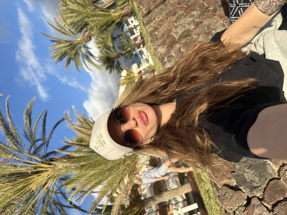 A woman with long, wavy brown hair poses for a selfie wearing a baseball cap, sunglasses, and a black shirt. Palm trees frame the shot, and a blue sky with scattered clouds is visible in the background. A stone wall sits to the right of the frame. Other people are sitting at tables in the background.