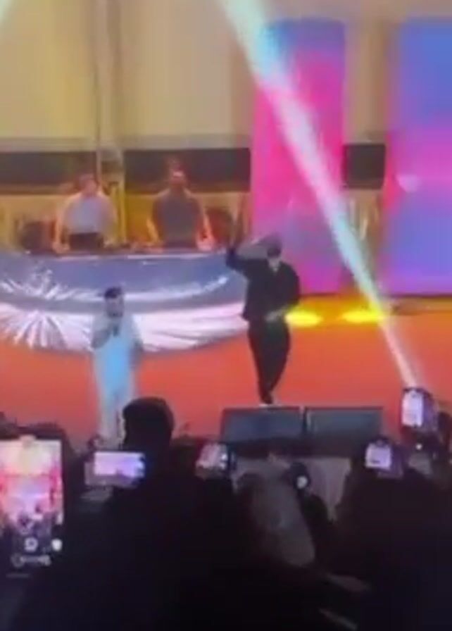two men on a stage, brightly lit with colorful background screens and spotlights. The man on the left wears a white outfit and holds a microphone, seemingly singing. The man on the right is dressed in black and moves around the stage, gesturing with his hands and appearing to engage with the crowd. The audience, visible in silhouette, holds up phones to record the performance. In the background, other figures stand behind a table, possibly operating sound or lighting equipment. The stage is red and there is a banner that says "Pakistan" in a glittery material. A purple column can be seen on the right.