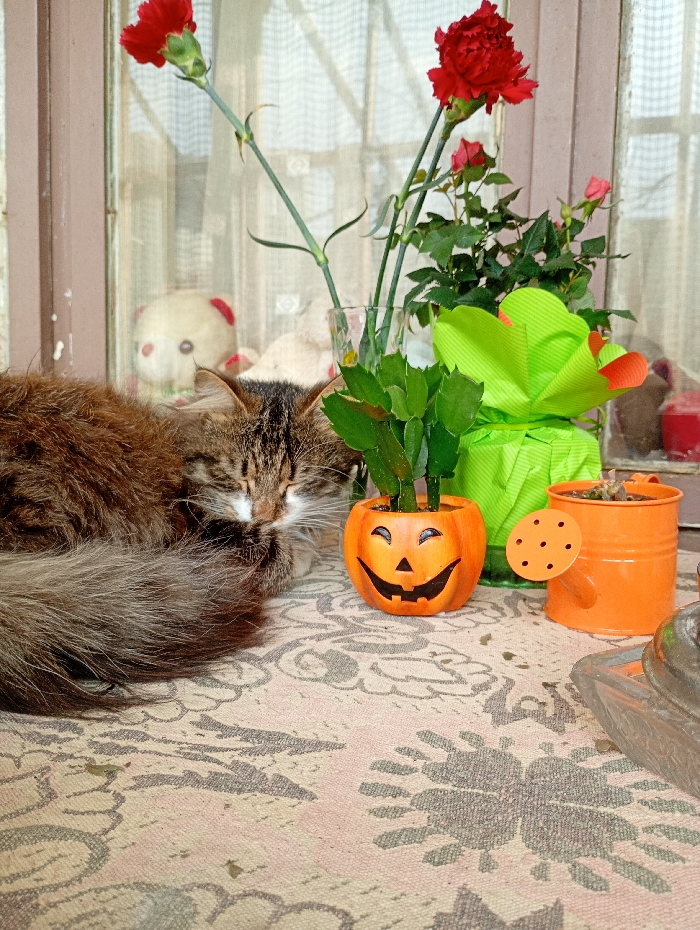 The scene depicts a domestic interior in Alfatar, Bulgaria, featuring a brown tabby cat resting on a patterned surface near a window. The cat, with closed eyes and a prominent bushy tail, occupies the left side of the frame. To its right, an arrangement of plants and decorative items is visible. Two red carnations stand upright in a clear glass vase. Next to them, a small green-leafed plant is contained within an orange, ceramic jack-o'-lantern shaped pot. Further right, another plant with green foliage and small pink flowers is encased in a bright green decorative wrapping. A miniature orange metal watering can is positioned near the wrapped plant, and a partial view of another small orange pot is seen on the far right. The background features a window with translucent white curtains, behind which two light-colored teddy bears are visible in a blurred state. The surface beneath the cat and objects is a light-colored textile patterned with grey and pink floral or abstract motifs.