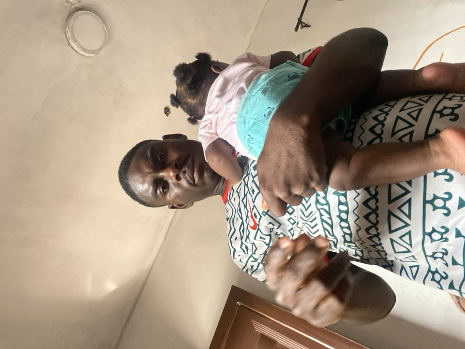 The image depicts an adult male holding an infant indoors in Ado, Nigeria