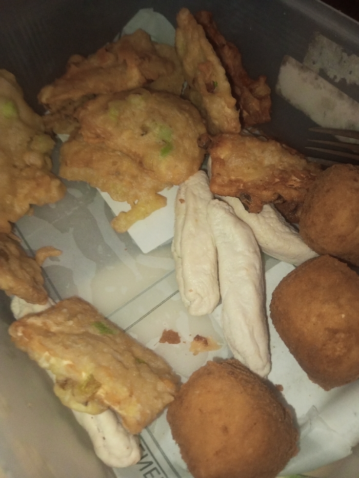 The scene depicts a close-up, high-angle view of various food items contained within a clear or translucent plastic container, observed in Bagochen Boolingpang Ueling, Bhutan. The container's bottom exhibits faint linear markings. A crumpled piece of white absorbent paper is positioned under several food items, showing oil saturation and scattered crumbs. The primary subjects are multiple portions of prepared food. These include: 1. Approximately ten to twelve pieces of irregularly shaped, deep-fried items, varying in size from 3 cm to 8 cm. These items are golden-brown with a crispy-looking batter, and some contain visible green fragments. 2. Six to seven smooth, off-white, elongated cylindrical or oblong food items, each approximately 5-7 cm long, are interspersed among the fried components. 3. Two distinctly rounded, breaded, deep-fried items, approximately 5 cm in diameter, exhibit a uniformly golden-brown, textured exterior. One is in the lower-right foreground, the other partially visible in the upper-right. 4. Two flat, rectangular objects, approximately 3-5 cm in length, are located in the upper-right area. One is uniformly white, and the other shows a faint grey textured pattern. A metallic fork, with two visible tines, is partially present on the right side of the container, positioned among the food items. The lighting is dim, creating shadows and reflections on the container's surface. No individuals are present in the image.