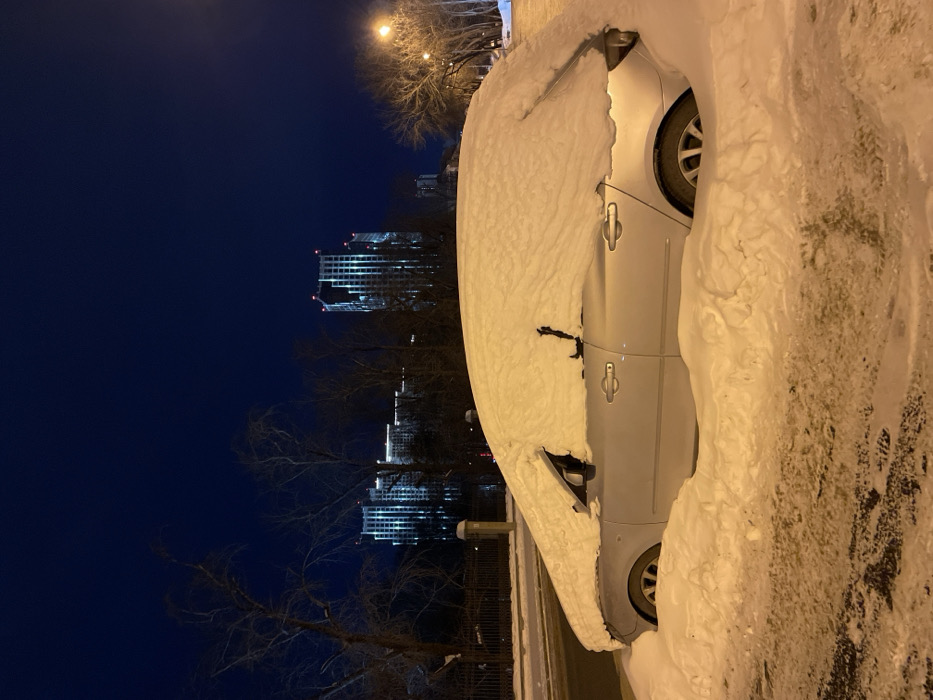 A snow-covered silver car is parked on a snow-lined street. The dark blue sky contrasts with the illuminated buildings in the background. Bare trees stand between the car and the cityscape. A street lamp glows above the car. The snow is thick and covers most of the vehicle, blending it with the roadside.