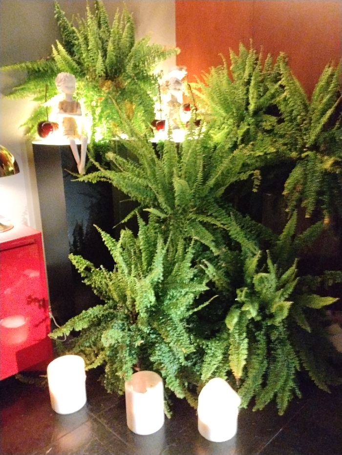 A lush arrangement of ferns dominates the view, with several large plants obscuring the background