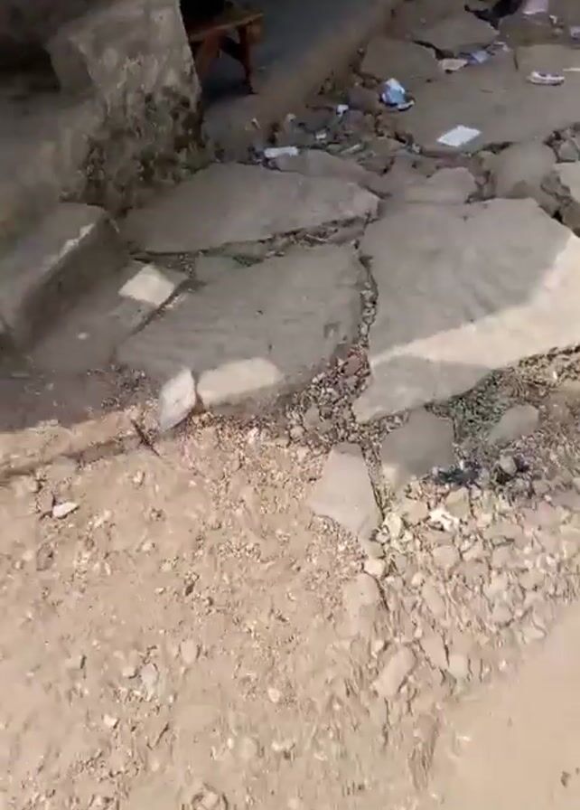 The video depicts a rundown outdoor scene in front of what appears to be a small shop or business. Several people are seated on chairs and stools, some holding children. The ground is a mix of dirt and broken concrete slabs, littered with small pieces of trash. A bicycle leans against a post in the background. The overall environment appears impoverished and neglected. There are no obvious interactions between the people present.