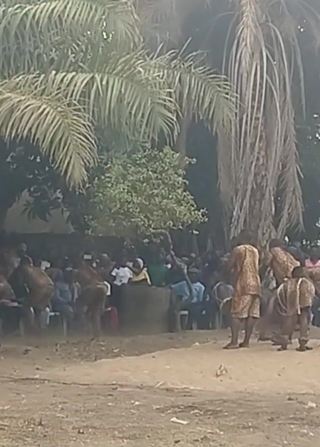 gathering of people seated on chairs, observing four individuals in traditional garb performing on a dirt ground. The performers appear to be wearing animal print outfits and headdresses. A person in a blue outfit stands to the left, near a speaker. Trees surround the open area where the performance is taking place. The overall impression is of a cultural event or performance being held outdoors. The day is overcast.