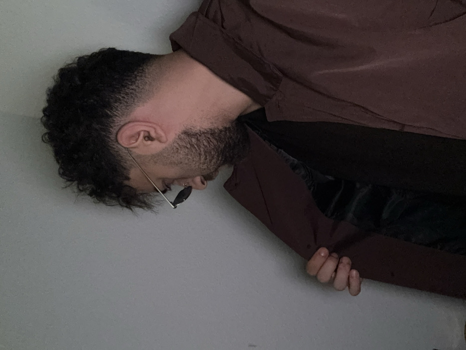 A man is pictured from the side, his head tilted downward. He sports a short, curly hairstyle with a faded haircut and a neatly trimmed beard. He is wearing glasses with thin frames and dark lenses. A brown jacket covers his body, with a glimpse of a black shirt visible underneath. His fingers are seen holding the jacket. The background appears to be a plain, light-colored wall.