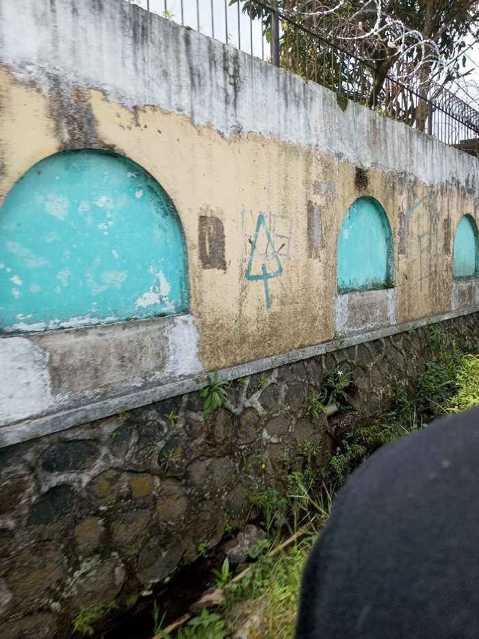 This image depicts a section of a weathered concrete and stone wall, located in Vieng Phouka, Laos. The upper portion of the wall is painted a faded, light yellow or beige, exhibiting significant discoloration, dark streaks from water runoff, and patches of peeling paint. Embedded within this section are at least three equally spaced, turquoise-painted arched recesses, also showing signs of paint deterioration and containing small amounts of green vegetation at their bases. Between the arches, graffiti is visible, including a prominent green stylized 'A' or triangle with an upward arrow, and other indistinct markings. A white concrete coping caps the top of the painted wall. Below the concrete wall is a foundation constructed from dark, irregularly shaped, mortared stones. Sparse green weeds and grass grow along the base of the stone foundation and within crevices. A narrow, dark channel, possibly containing water, runs along the very bottom of the wall, partially obscured by vegetation. Above the wall, a dark metal fence with vertical bars is visible, topped with coils of razor wire. Behind the fence, dense green foliage from trees is present, under a bright, possibly overcast, sky. The lower right foreground is occupied by a blurred, dark object, likely part of a person's shoulder or a vehicle interior, indicating a close-up perspective from a slightly elevated position. No people are directly visible. The scene is static, documenting environmental wear and human markings.