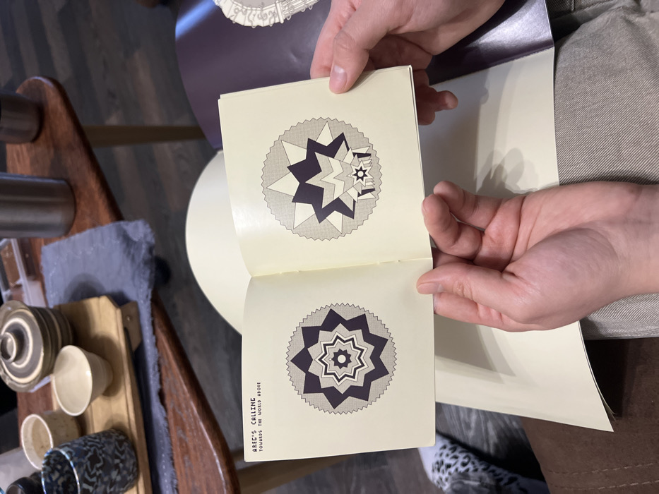A pair of hands holds open a small, light-yellow booklet. The left page displays the text "AREC'S CALLING" and "TOWARDS THE WORLD ABOVE," positioned above a circular graphic design composed of concentric star-like patterns in dark purple, grey, and white, with a jagged outer edge. The right page features a similar circular design, also in dark purple, grey, and white, but depicting star-like patterns in an outwardly expanding or fragmented configuration. The hands rest on a lap clothed in light-colored fabric. A foot clad in a leopard-print slipper or sock is partially visible on the lower left. In the background, a dark wooden table with light-colored wooden legs supports a collection of ceramic ware on a dark grey fabric mat. Objects on the table include a dark patterned cup, a small cream-colored bowl, a lidded striped pot, and another small light-colored cup, along with two silver-colored metallic thermoses or cups. The floor is dark wood. A cream-colored chair back or furniture element is partially visible behind the booklet. The specific location within the city of Rostov-on-Don, Russia, is not discernible from the image.