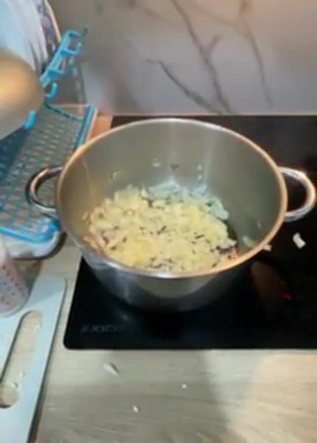 kitchen scene. A silver stockpot filled with sauteed onions sits on a black stovetop. Next to it, a small saucepan contains melted butter, also on the stovetop. A green plate with a flower design holds sliced carrots. A white plastic bag, onion, spoons, and a knife are scattered on the countertop. A dish rack is partially visible in the top left corner.