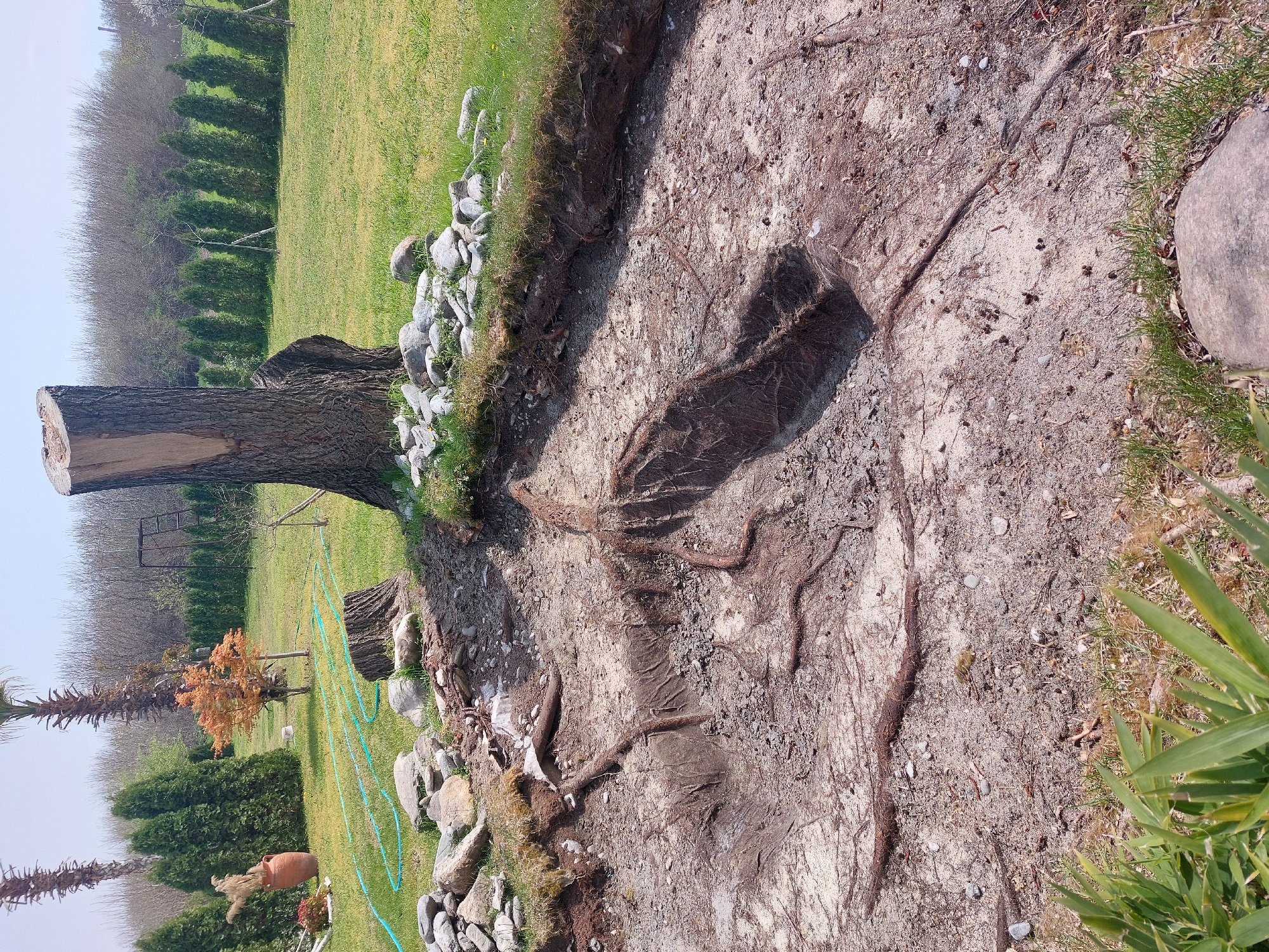 The image depicts a scene in Stamboliyski, Bulgaria, featuring a partially excavated tree stump and its exposed root system. The stump is located at the edge of a grassy lawn, bordered by a row of rocks. The excavated area reveals a network of roots extending into the surrounding soil. In the background, there are other trees, shrubs, and a grassy field. The lighting suggests a daytime scene.