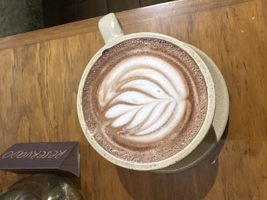 - "An overhead view depicts a light beige ceramic mug filled with a dark brown beverage, presumably hot chocolate, topped with white latte art in a complex, multi-leaf pattern" by FM-3UnWB3, licensed under CC BY 4.0