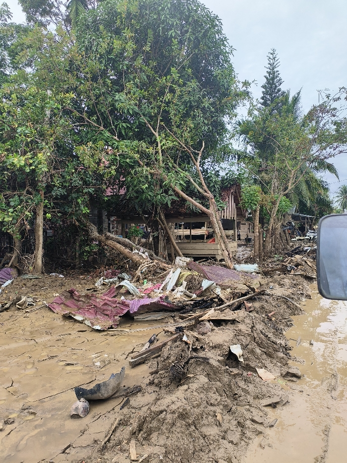 The scene reveals the aftermath of a destructive event. A muddied landscape is strewn with debris, including fragmented building materials and mangled metal sheets. Trees stand amidst the chaos, some uprooted or damaged. A partially collapsed building with its support beams visible is in the background. The foreground showcases thick layers of mud, suggesting a flood or landslide. The overall impression is one of significant devastation and environmental disruption.