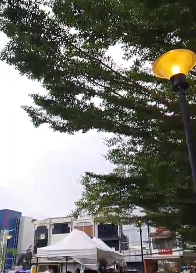 The camera pans across a public park with a casual atmosphere. Several people are strolling or sitting on the grass. Some are gathered around a tent-like structure where a band seems to be setting up or playing. A man walks by carrying a large bunch of colorful balloons. Buildings are visible in the background, and the sky is overcast. The park is illuminated by lampposts with rounded, yellow lights. Trees provide shade, and the overall impression is of a relaxed outdoor gathering.