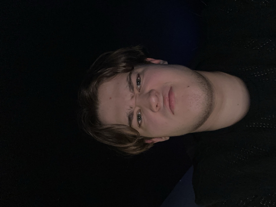 The image displays a headshot of a young adult male, facing the camera with a grimacing expression characterized by furrowed eyebrows, a wrinkled nose, and pursed lips. He has light brown, medium-length hair, light-colored eyes, and visible stubble on his chin and jawline. A small red mark is present on his forehead. The male is wearing a dark, possibly black, long-sleeved garment with a textured pattern. The background is uniformly dark and featureless, providing no discernible environmental details or specific landmarks within the city of Edson, Canada. The subject is illuminated by frontal lighting, contrasting with the dark surroundings.