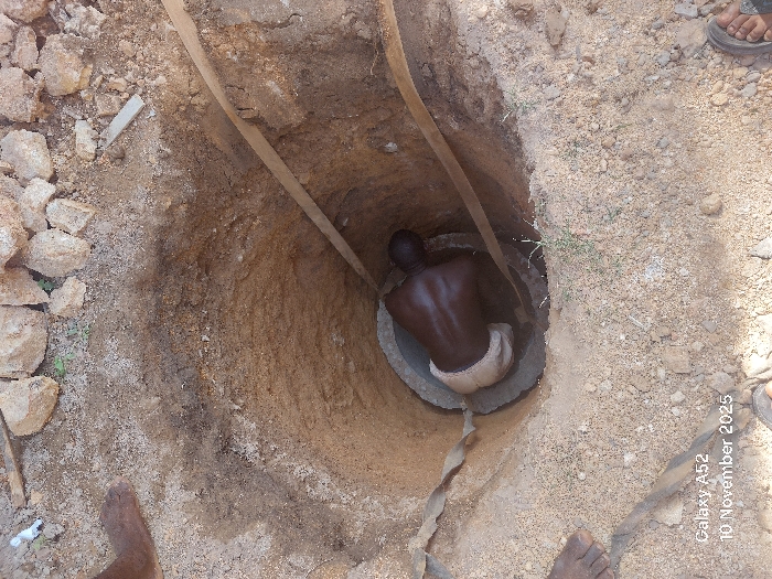 The scene is an outdoor, vertical view into a circular earthen excavation in Akwanga, Nigeria