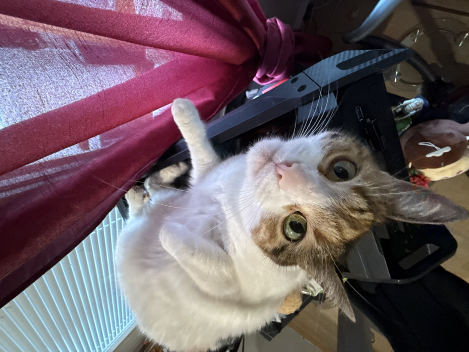 A domestic short-haired cat is depicted indoors, lying on its back on a dark, possibly metallic, surface. The cat is white with brown and orange tabby markings on its head, ears, and patches on its body, possessing prominent greenish-yellow eyes and a pink nose. Its whiskers are visible, and its paws are curled, indicating a relaxed or playful pose as it looks directly at the camera. In the background, above the cat, a window with white horizontal blinds is partially visible, alongside dark pink sheer curtains, one of which is gathered and tied. Below the cat and the dark surface, a brown plush object with white details, resembling a deer, is partially visible, along with glimpses of green and red elements and a metallic curved object. The specific location within the city of Kyustendil, Bulgaria, cannot be determined from the visual evidence presented.