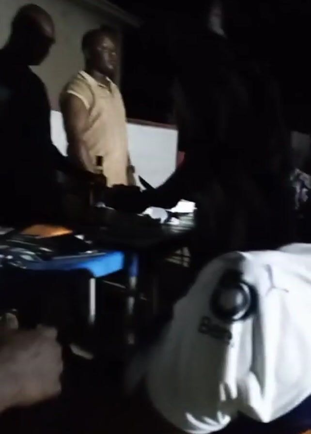 dimly lit outdoor scene at night. A small group of men are gathered around a blue folding table. One man, wearing a green patterned shirt, is seated at the table, looking down and possibly writing or looking at something on the table. Two other men are standing behind the table; one is dressed in a light-colored, short-sleeved shirt, while the other is mostly in silhouette. A bottle can be seen on the table near the standing man in the light-colored shirt. In the foreground, another man is seated on an orange chair, wearing a white shirt with a dark blue shoulder and a logo on the back. A white building can be seen in the background. The scene is dark, making details difficult to discern.