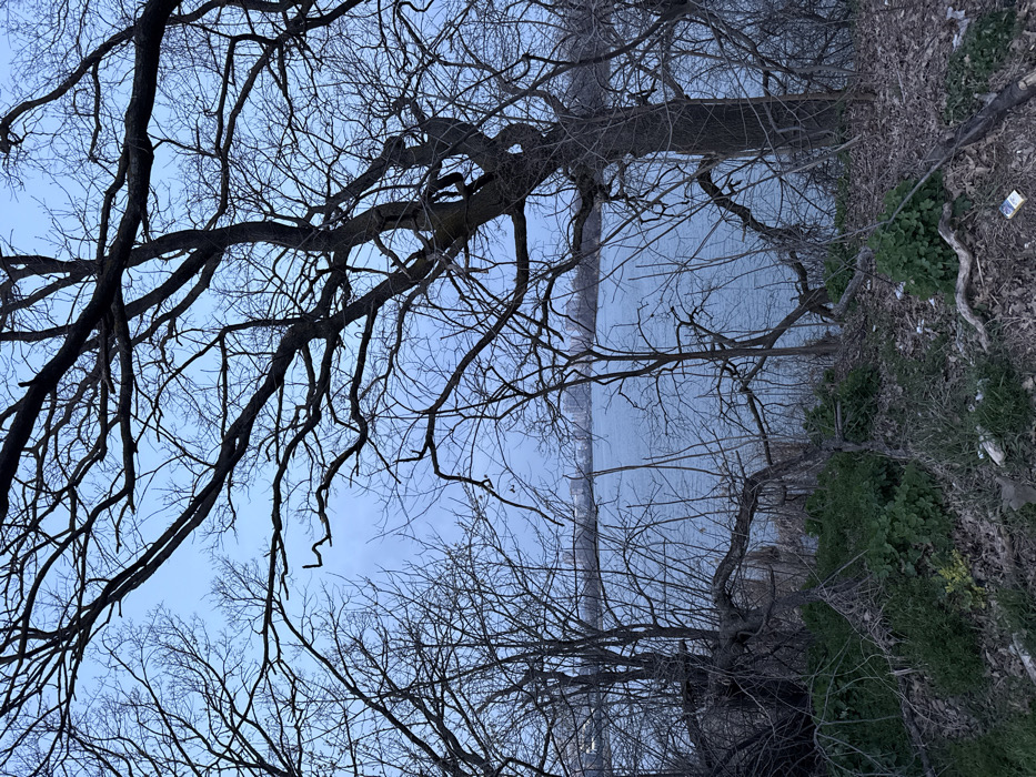 The image displays a waterfront scene at an undetermined time of day, likely twilight or dawn, in the city of Unknown, Unknown. The foreground is occupied by a dense arrangement of bare deciduous tree branches and trunks, silhouetted against the ambient light. The ground directly beneath the trees is an uneven surface covered with dried leaves, sparse green undergrowth, and scattered debris, including white plastic fragments and a white and yellow cigarette pack in the lower right quadrant. Beyond this immediate vegetation, a calm, light blue body of water extends across the midground. In the far distance, a low-contrast cityscape is faintly visible on the horizon, comprising multiple structures and buildings. No individuals, animals, or active subjects are present in the scene.