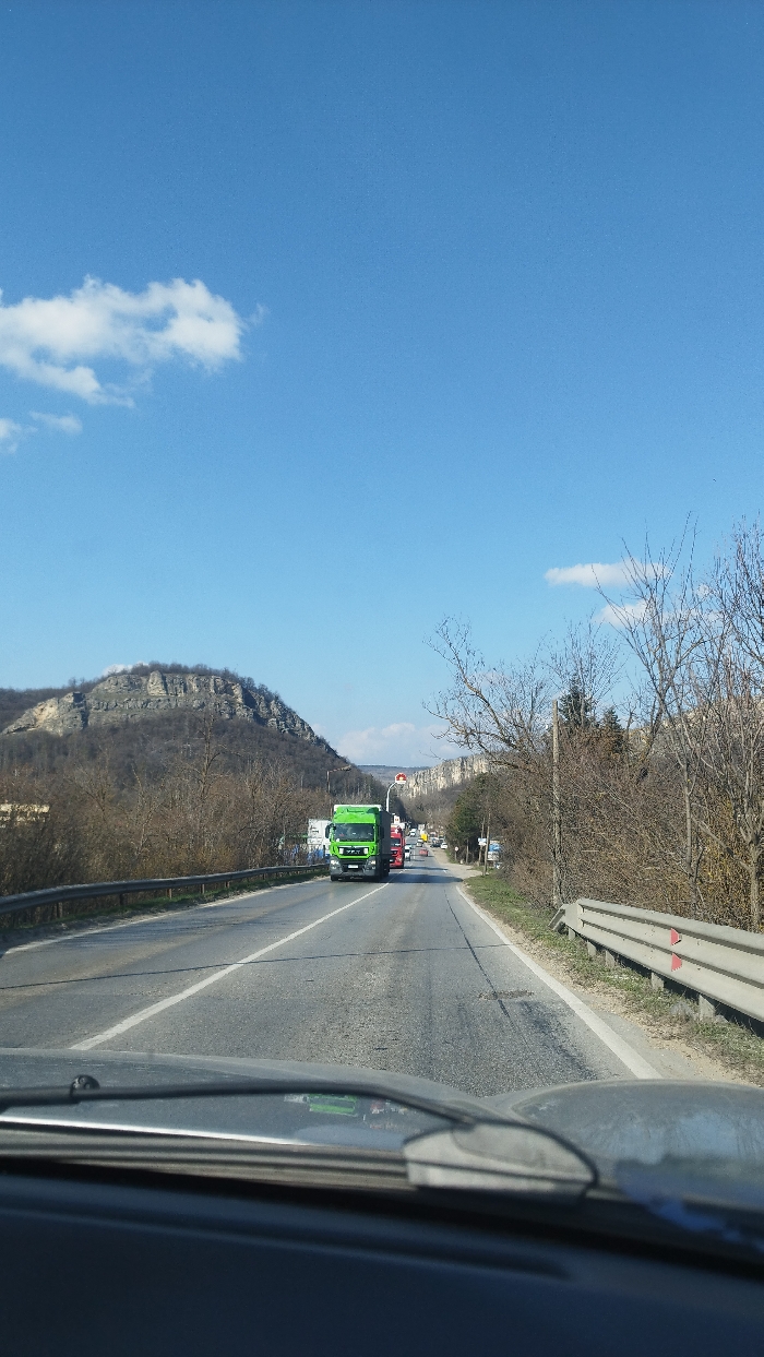The image displays a daytime scene from the interior of a vehicle, looking forward through the windshield, on a two-lane asphalt road in Veliko Tarnovo, Bulgaria. The sky is clear blue with a single distinct white cumulus cloud visible in the upper left. The road features a solid white line and a broken white line, separating directions of travel. In the oncoming lane, a bright green MAN semi-trailer truck is prominent, followed by a red semi-trailer truck and other vehicles receding into the distance. Metal guardrails are present on both sides of the road; the right guardrail includes red reflective markings. The road surface shows visible wear and patching. To the left of the road, a significant rocky hill or mountain rises, characterized by visible horizontal stratification and sparse, bare deciduous vegetation. To the right, an embankment covered in bare deciduous trees and brush ascends, with further rocky cliffs discernible in the distance along the road. The lack of foliage on trees suggests late winter or early spring. The lower foreground shows the top of a vehicle's dashboard and the base of its windshield with wipers. No people are visible.