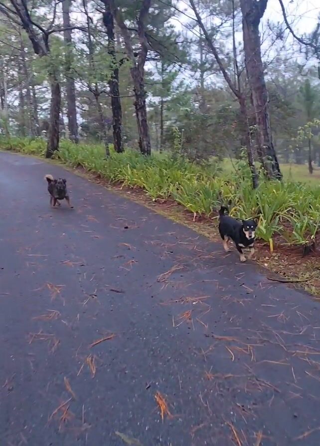two dogs running on an asphalt road in a forested area. One dog is a dark brown, tan, and black color with a bushy tail. The other dog is primarily black with tan markings. The road is wet and covered with pine needles. The trees are tall and thin, with green foliage along the sides of the road. The sky is overcast. The camera is following the dogs as they run.