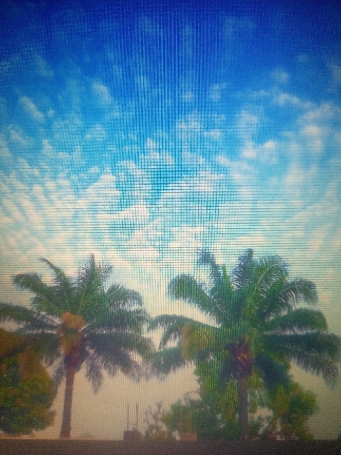 The image displays an outdoor scene set against a blue sky with scattered white cumulus clouds, occupying approximately the upper two-thirds of the frame. In the lower third, two prominent palm trees with green fronds are visible, their trunks extending from an indistinct lower section. Additional green foliage is present below and between the palm trees. The lowest portion of the image contains a dark, undifferentiated foreground element. The entire image exhibits a prominent grid of horizontal lines, consistent with a display capture or scanline artifact. No human subjects, animals, or explicit actions are discernible. The depicted environment is in Akwanga, Nigeria.