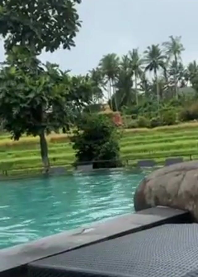 swimming pool with a view of rice terraces and palm trees. The camera is positioned near the edge of the pool, behind a dark gray outdoor lounge chair. The pool water is clear and turquoise in color, with gentle ripples on the surface. The rice terraces are lush and green, and a small statue is visible on a hill in the background. The sky is overcast, and the light is soft.