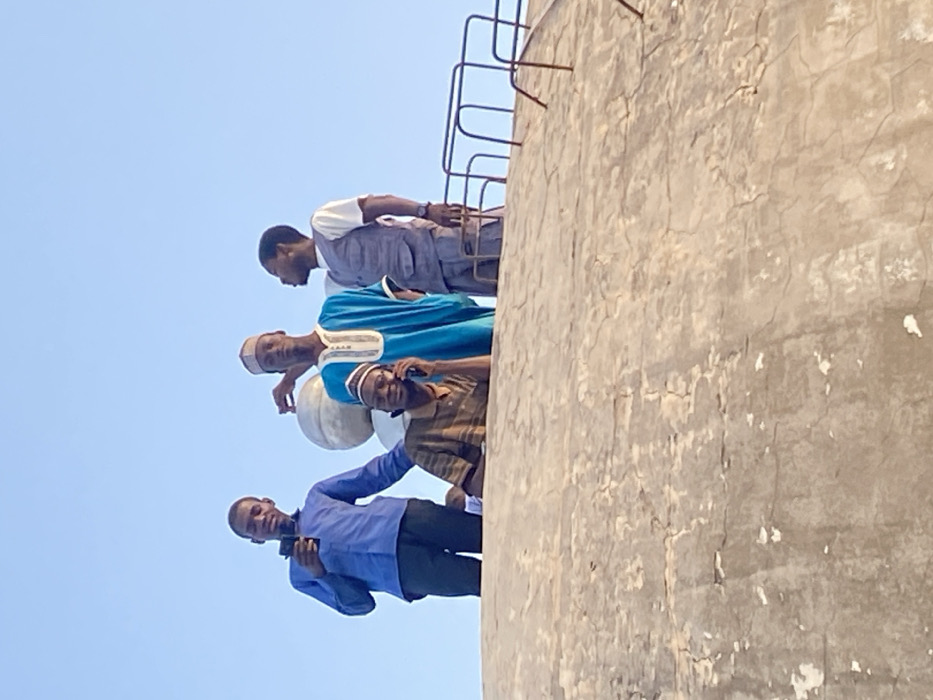 Four males are observed atop a large, light grey concrete dome or roof structure in Barako, Nigeria, against a clear blue sky