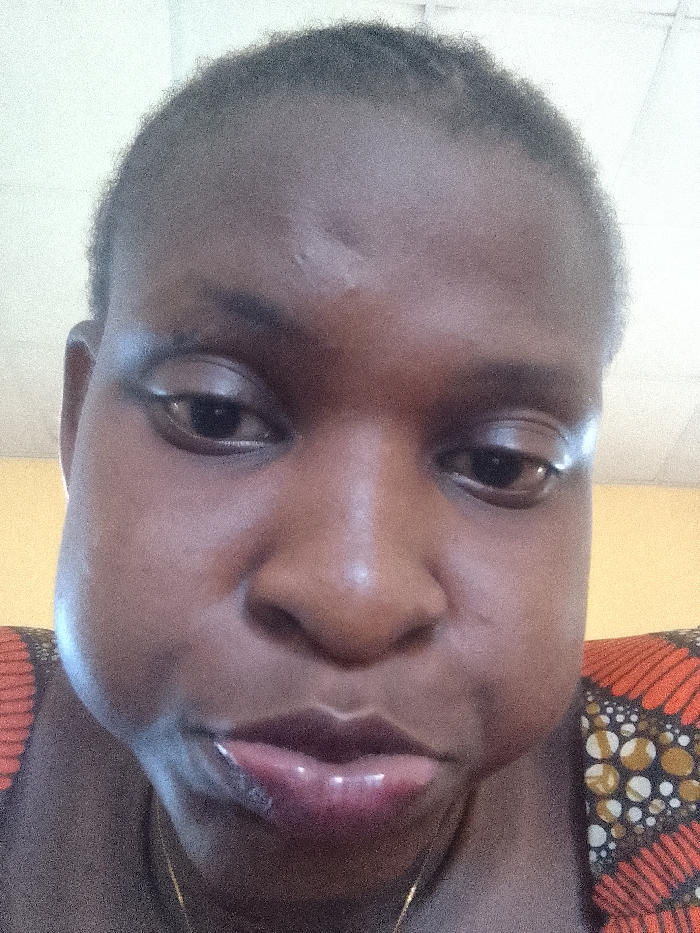 This close-up portrait depicts an individual, likely an adult female with dark skin, facing the camera directly