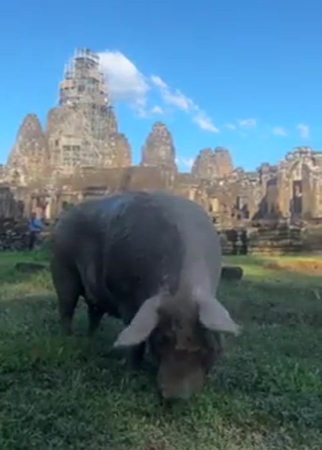 large, gray pig foraging in a grassy area. The pig is covered in mud and has long, floppy ears. In the background, there is a large, ancient stone temple under construction, with scaffolding visible. The sky is bright blue with a few scattered clouds. There is a person sitting in the background near the temple. The camera is relatively stable, providing a clear view of the pig and its surroundings.