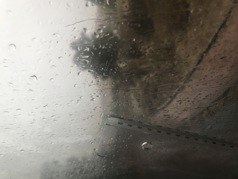 wet surface, possibly a window, covered in raindrops. A ruler lies diagonally across the lower right portion of the frame, indicating centimeters and millimeters. The background is blurred and indistinct, but suggests trees and possibly a building, obscured by rain and the wet surface. The lighting is overcast and dim, contributing to the overall rainy atmosphere.
