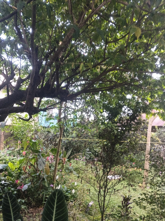 The image presents a detailed view of a dense, verdant outdoor environment, located within the city of Unknown, Vietnam. The scene is dominated by a lush array of plants and foliage under diffuse daylight. In the immediate foreground, two large, dark green leaves with distinct veining are partially visible, positioned at the bottom of the frame. The midground features a thick growth of diverse green vegetation, including shrubs and smaller plants, interspersed with blossoms displaying shades of pink and white. A slender, light-colored rope or wire stretches horizontally across the mid-right section, partially obscured by leaves. A vertical pole, possibly bamboo, stands slightly to the left of the frame's center. Behind the dense foliage, structural elements of human habitation are discernible: a section of a light blue building wall is visible in the upper-left midground, and a fragment of a reddish-brown corrugated roof appears in the upper-right midground. The upper portion of the image is filled by the expansive, leafy canopy and complex network of dark, intertwining branches of a large tree. Within this canopy, a green band or tie is observed wrapped around one of the tree's branches. No individuals are present, and no active interactions or specific actions are depicted within the static scene.
