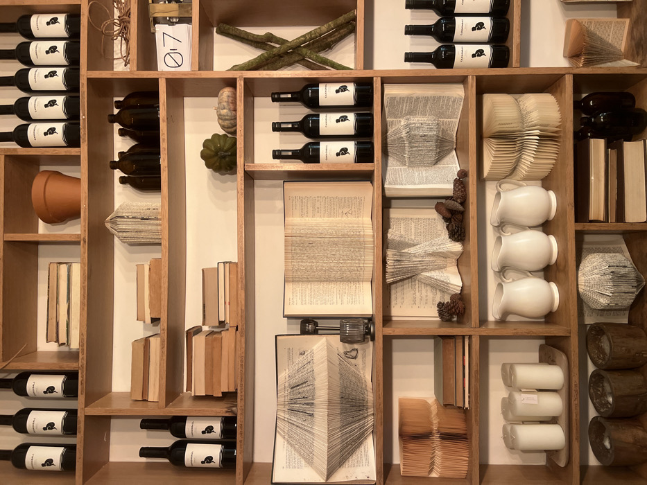A wooden shelving unit displays an eclectic mix of objects. Wine bottles sit alongside vertically stacked books and folded book art. Pottery items, including a terracotta pot and white pitchers, share space with bundles of twigs, gourds, and cylindrical candles. The shelves create a visually interesting display of contrasting textures and shapes.