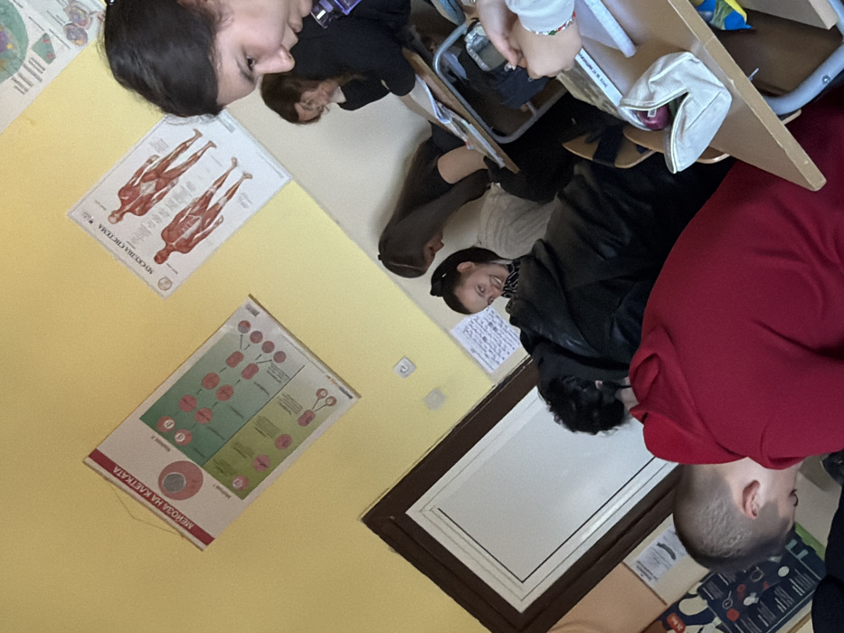 The image displays an indoor classroom environment located in Cherven Bryag, Bulgaria. The room features light yellow walls, a brown-framed door with a white panel on the left, and educational posters. Prominently displayed on the left wall is a poster titled "МЕЙОЗА НА КЛЕТКАТА" (MEIOSIS OF THE CELL), illustrating stages of cellular division. To its right, another poster labeled "МУСКУЛНА СИСТЕМА" (MUSCULAR SYSTEM) depicts human anatomical musculature. Multiple individuals, appearing to be students, are seated at desks. In the immediate foreground on the right, the hands and forearms of a person wearing a white long-sleeved garment and a white and red beaded bracelet are visible, positioned over a beige open pencil case on a wooden desk. Adjacent, a young woman with dark hair, wearing a dark top and a purple lanyard, is depicted looking downwards. Behind her, another young woman with glasses, also in a dark top, rests her head on her hand. Towards the center-left mid-ground, a young woman with dark hair tied in a high ponytail and wearing a white shirt directly faces the camera with a clear smile. In front of her, a person with dark, curly hair wearing a dark jacket is bent over a desk, facing away from the camera. In the lower-left foreground, a young male with short, light hair and a red hooded sweatshirt is hunched over his desk, focused downwards. The overall scene indicates an active classroom setting with students engaged in various tasks, one acknowledging the presence of the camera.