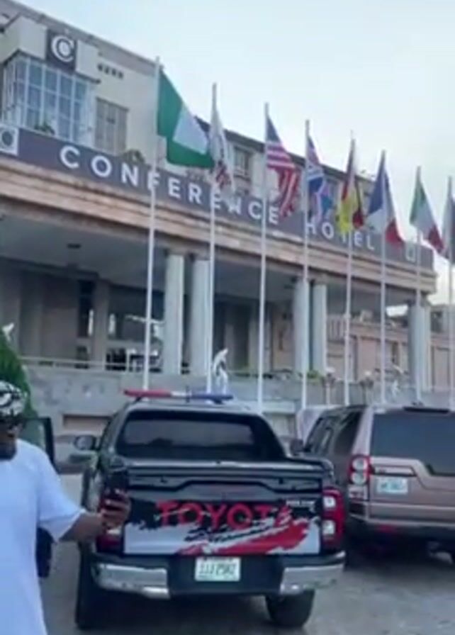 exterior of Conference Hotel, a multi-story building with a beige facade and many windows. The hotel's name is prominently displayed above the entrance, and several flags from different countries are flying in front. There are two vehicles parked in front of the hotel: a black Toyota pickup truck with red and white graphics and a brown SUV. Several people are walking around the vehicles and towards the hotel entrance. The sky is overcast, and the general atmosphere is calm. A man in a white outfit and patterned hat is visible, holding a phone.