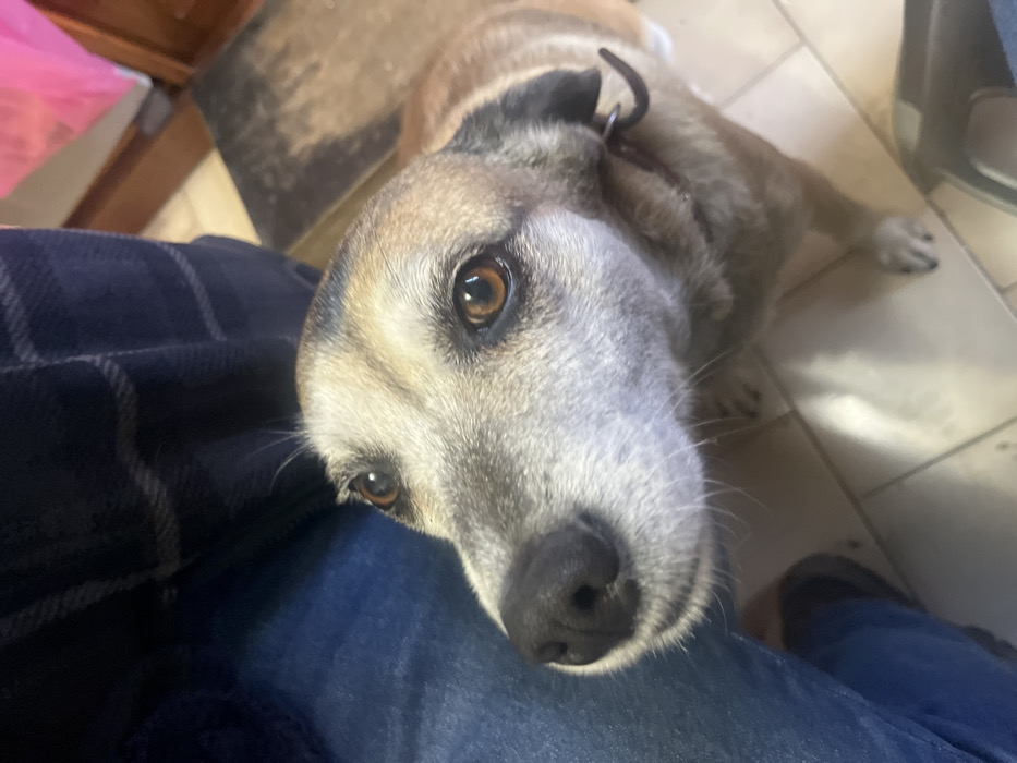A dog with graying fur and brown eyes looks directly at the camera with an endearing expression. The dog is lying down with its head resting on someone's lap, who is wearing a navy blue plaid shirt and jeans. The background includes tiled flooring, a dark patterned mat, and a hint of furniture, suggesting the photo was taken indoors. The dog's collar is visible, indicating it's a pet.