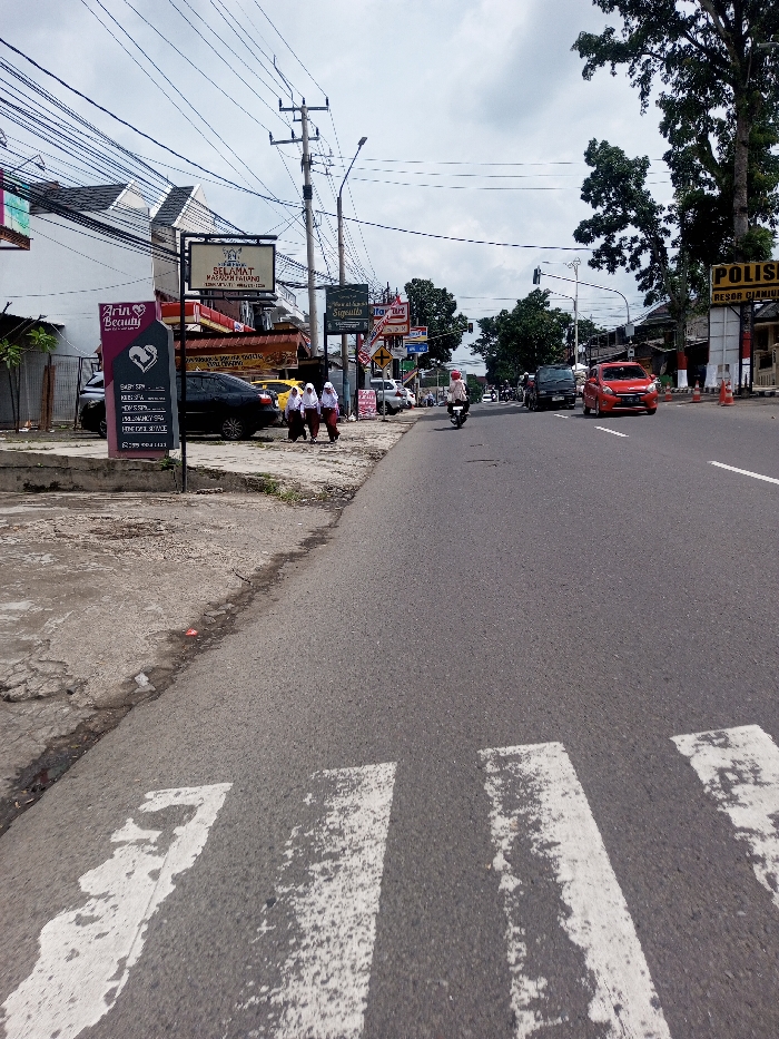 The image captures a daytime street scene from a low-angle perspective, looking down a two-lane asphalt road with a pedestrian crosswalk marked by white stripes in the immediate foreground. On the left side, a cracked concrete sidewalk runs parallel to the road. Two multi-layered street signs are prominent: an upper cream-colored sign partially displaying "SELAMAT... PAWENGDENG," and a lower vertical, heart-shaped pink and purple sign for "Arin Beauty" listing services like "HAIR SPA" and "FACIAL." Behind these signs, a black sedan is parked on the shoulder, and a yellow vehicle is partially visible further back. Three individuals, identified as young females in white shirts and reddish-brown skirts (school uniforms), walk along the sidewalk away from the viewer. A dense network of overhead utility wires spans across the frame, supported by utility poles lining the street. Other commercial buildings with various signs, including "Sigurla" and "Tarum," are visible further down the left side. On the road, traffic includes a red hatchback in the right lane, moving towards the viewer. A motorcyclist wearing a helmet rides a dark motorbike in the center of the road, moving away from the viewer. Other vehicles, including an SUV or minivan, are present further down the road. On the right side of the road, a large vertical sign with "POLISI RESOR CIAMIS" is clearly visible, positioned near the road shoulder, indicating a police facility. Two orange traffic cones are placed nearby. Tall, leafy green trees line the background on the right. A traffic light is visible further down the street. The sky is overcast with patches of clouds.