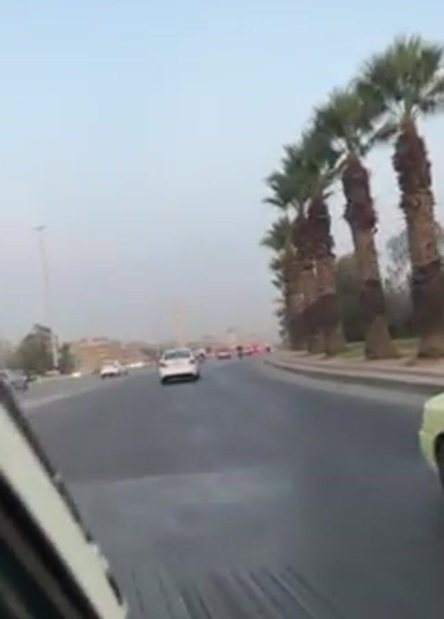 The view from a moving car is shown driving on an urban road, lined with tall palm trees. Other cars are visible driving in the same direction, and buildings are seen in the distance. The sky is a pale blue.