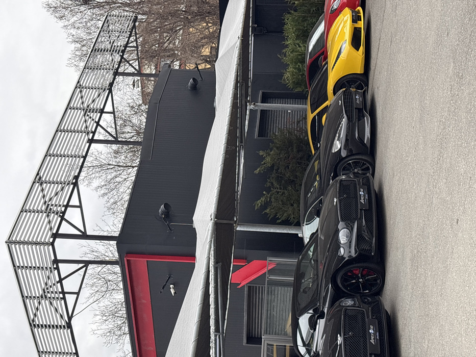 The scene depicts an outdoor parking area in front of a modern commercial building, identified as Apex One Motors, located at ul. "Boris Atanasov" 25, 1712 Sofia, Bulgaria. Five luxury vehicles are parked in a diagonal line from left to right on a paved surface. From left to right, the visible vehicles include a partial view of a black car, a black Bentley Continental GT Convertible with "Apex One" on its license plate holder and red brake calipers, a black Aston Martin Vanquish also with an "Apex One" license plate holder, a yellow Ferrari 488 GTB, and a partial view of a red Porsche. Above the vehicles, a white canopy extends from the building, supported by metal poles. The building facade is primarily dark grey or black, featuring a prominent red trim element on the upper left section. Multiple exterior lights and a security camera are mounted on the facade. Green shrubs are visible in a landscaped strip between the parked cars and the building. A metallic roll-up door is visible on the right side of the building. Above the building, a large metal framework structure, possibly a pergola or rooftop signage support, extends across the top, featuring horizontal slatted elements. Beyond the building and structure, bare deciduous trees are visible against an overcast, light grey sky. No individuals are present in the image.